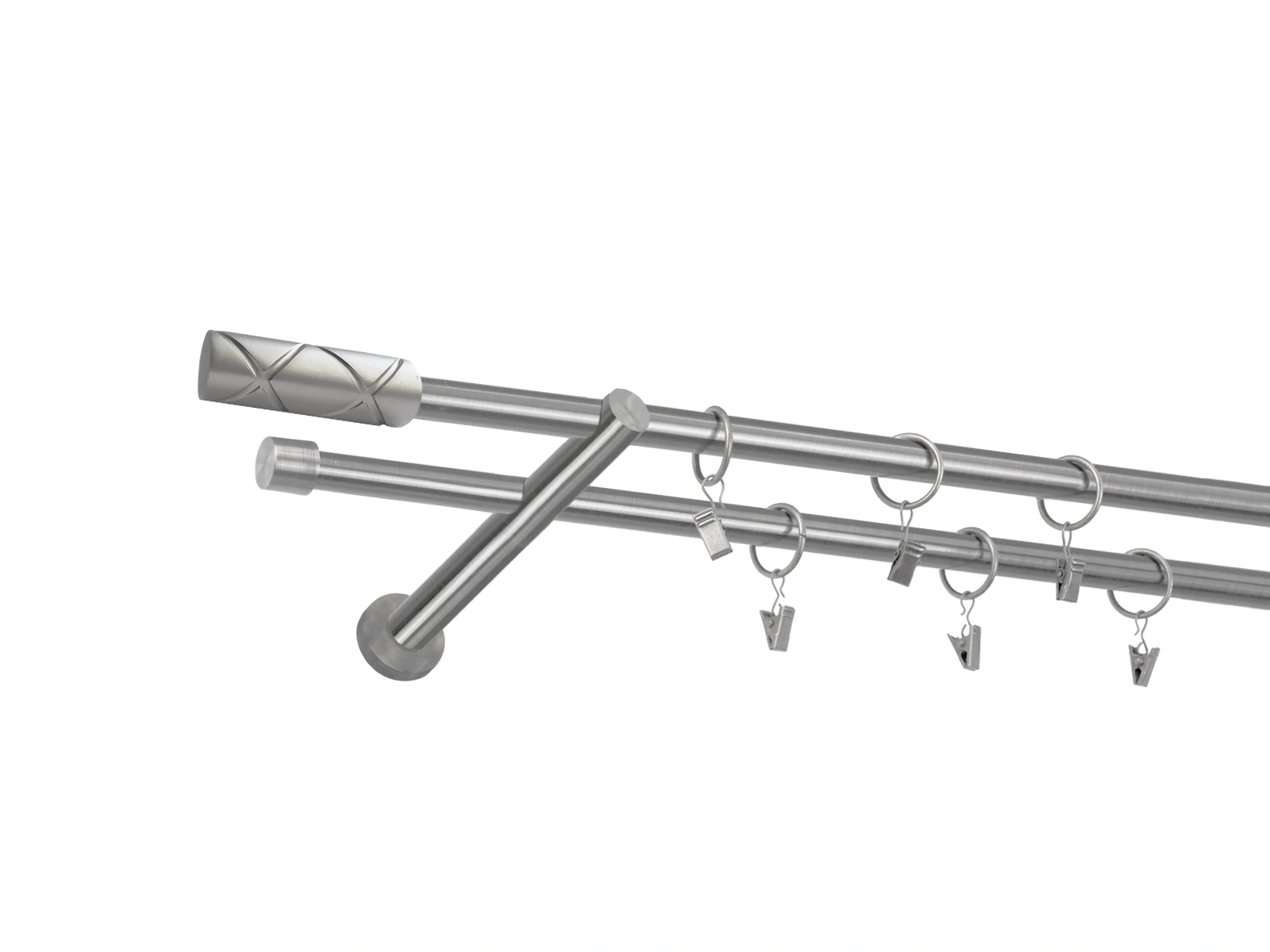 • Dĺžka 2200 mm - tyč 16mm - 2200mm - 2ks, držiak dvojitý - 2ks, koncovka - 2ks, koncovka zadná (PULLO) - 2ks, krúžok so štipcom - 42ks (pri výbere parametra príslušenstvo s krúžkami so štipcom), skrutky a hmoždinky na montáž