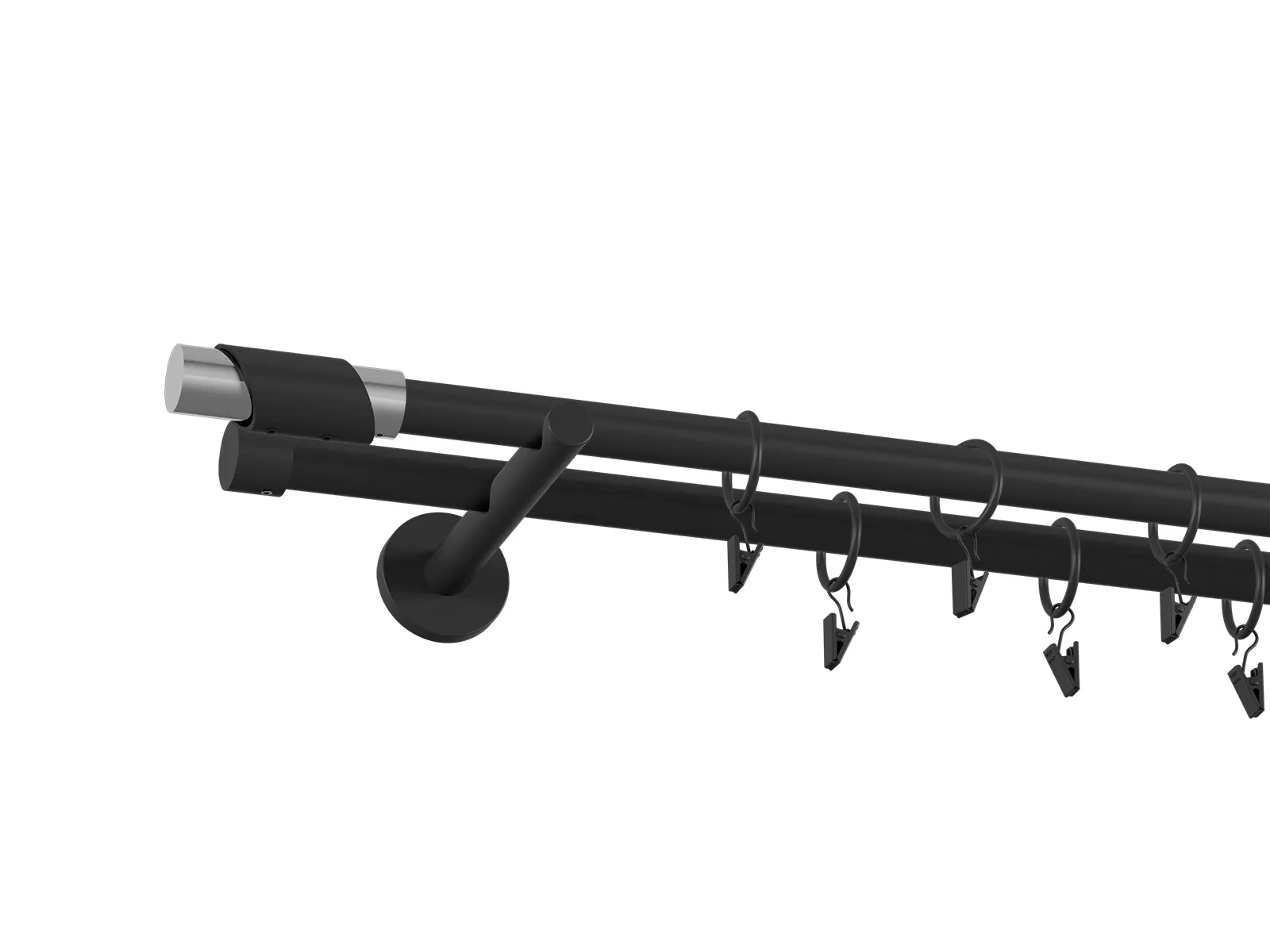 • Dĺžka 1600 mm - tyč 19mm - 1600mm - 2ks, držiak dvojitý - 2ks, koncovka - 2ks, koncovka zadná (PULLO) - 2ks, krúžok so štipcom - 30ks (pri výbere parametra príslušenstvo s krúžkami so štipcom), skrutky a hmoždinky na montáž